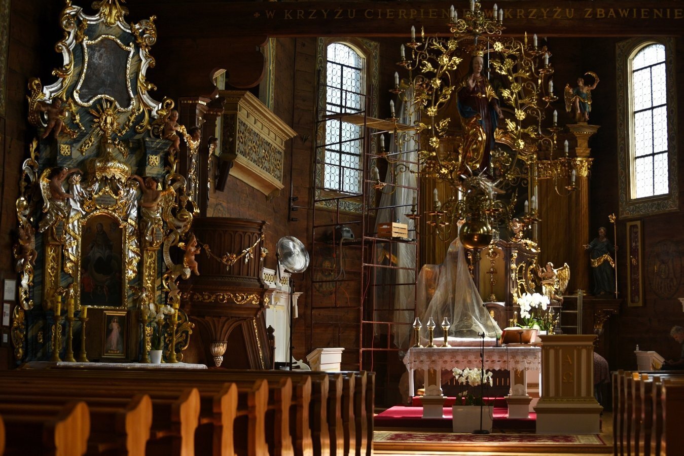 - Zobaczysz wnętrze z bogato zdobionym barokowym ołtarzem głównym i bocznymi, oryginalną amboną, chrzcielnicą w kształcie muszli i inne elementy artystyczne.