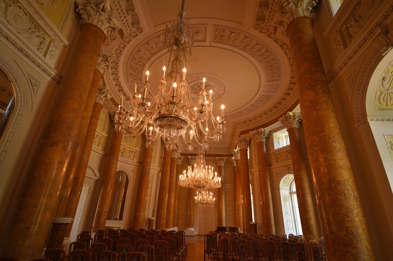 - Sala Kolumnowa — reprezentacyjne pomieszczenie z marmurowymi kolumnami korynckimi i bogatą dekoracją stiukową.