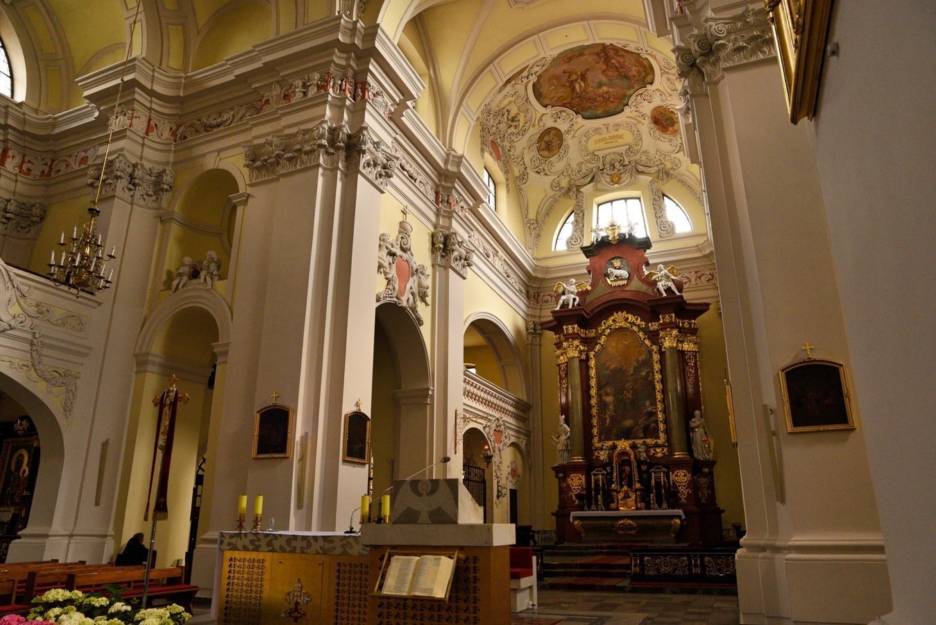 We wnętrzu bazyliki uwagę przyciąga również okazały ołtarz główny z XVIII wieku z obrazem Trójcy Świętej, przypisywanym włoskiemu malarzowi Michelangelo Palloniemu. Oprócz niego znajduje się tu dziesięć ołtarzy bocznych, każdy bogato zdobiony i poświęcony różnym świętym. Zachwyt budzi także drewniana, rzeźbiona ambona o wyjątkowo misternym detalu oraz zabytkowe organy, które nie tylko zdobią wnętrze, ale także rozbrzmiewają podczas uroczystości i koncertów muzyki sakralnej.