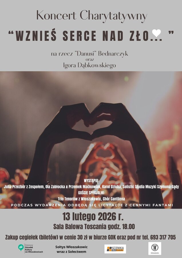13 lutego 2026 roku o godzinie 18:00 w sali balowej Restauracja Toscania odbędzie się wyjątkowy koncert charytatywny pod hasłem „Wznieś serce nad zło…”. Całkowity dochód z wydarzenia zostanie przeznaczony na pomoc Danuta Bednarczyk oraz Igor Dąbkowski – mieszkańców Włoszakowic, którzy mierzą się z ciężkimi chorobami i potrzebują wsparcia w leczeniu oraz rehabilitacji.