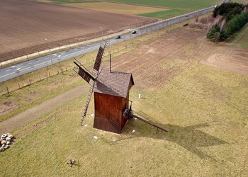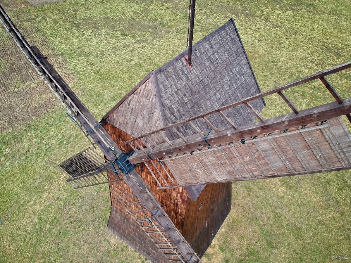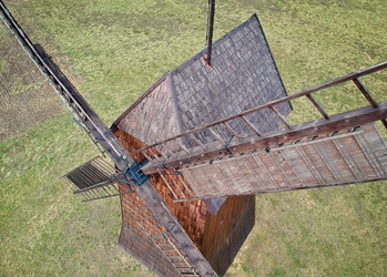 - Typ: koźlak – całkowicie obrotowa konstrukcja górna osadzona na drewnianym kozle, umożliwiająca ustawianie łopat wiatrowych względem z kierunku wiatru.