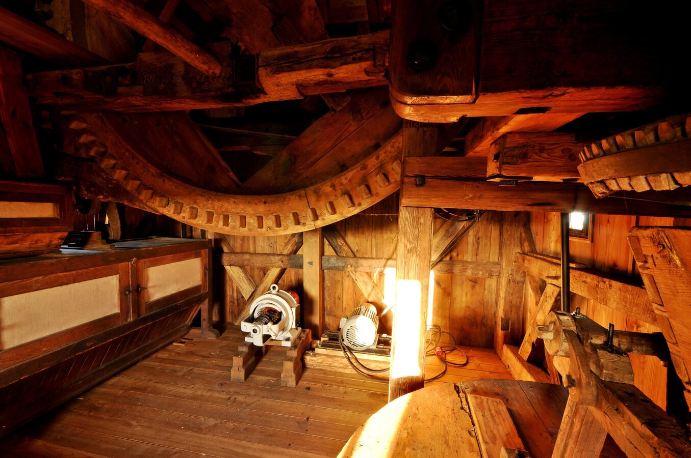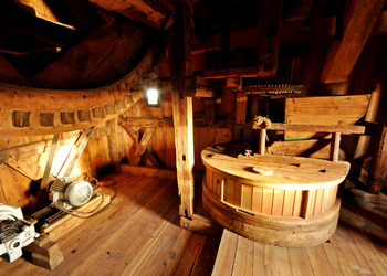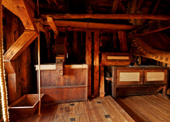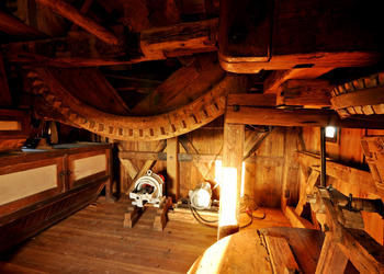 - Wyposażenie: zachowane elementy mechanizmu: koło paleczne, sztąber, mącznica – wszystko pokazuje proces przemiału zboża dawniej.