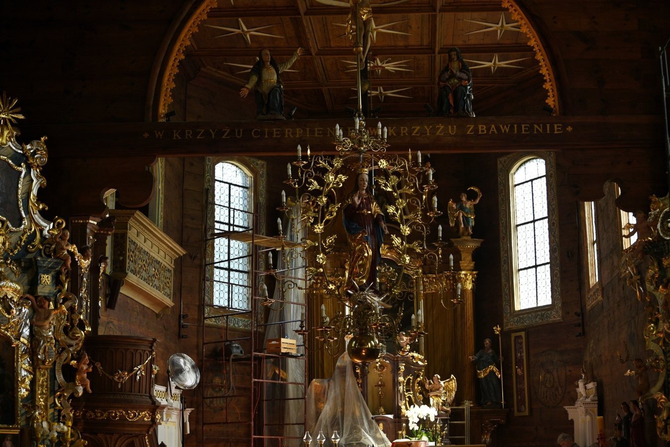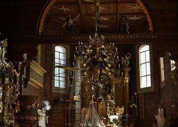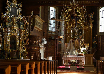 - Zobaczysz wnętrze z bogato zdobionym barokowym ołtarzem głównym i bocznymi, oryginalną amboną, chrzcielnicą w kształcie muszli i inne elementy artystyczne.