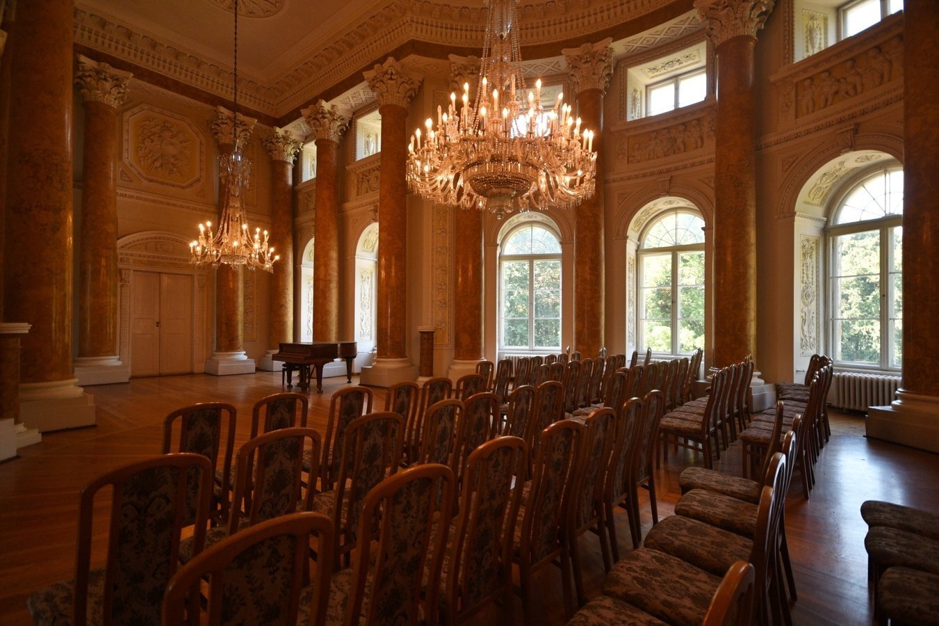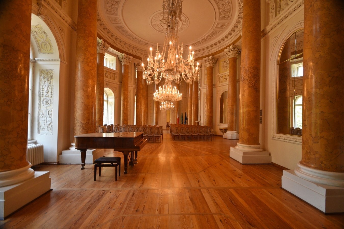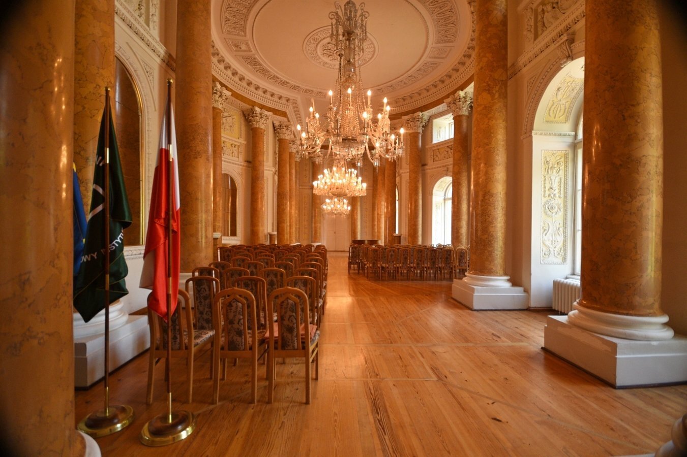 - Sala Kolumnowa — reprezentacyjne pomieszczenie z marmurowymi kolumnami korynckimi i bogatą dekoracją stiukową.