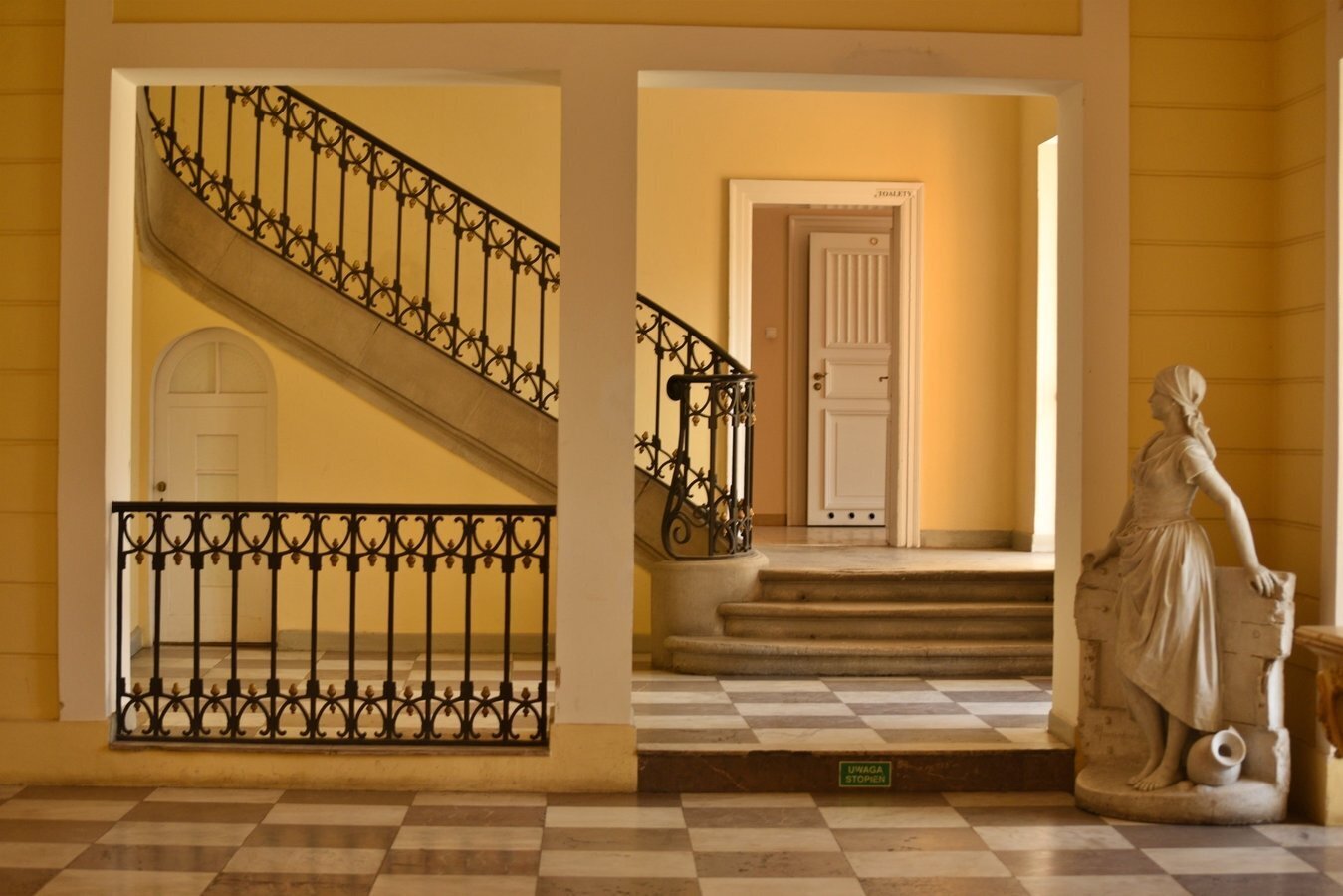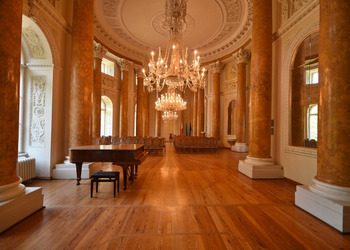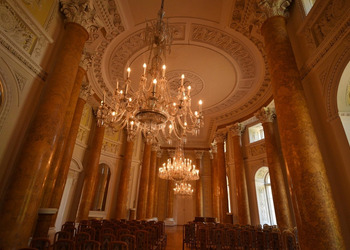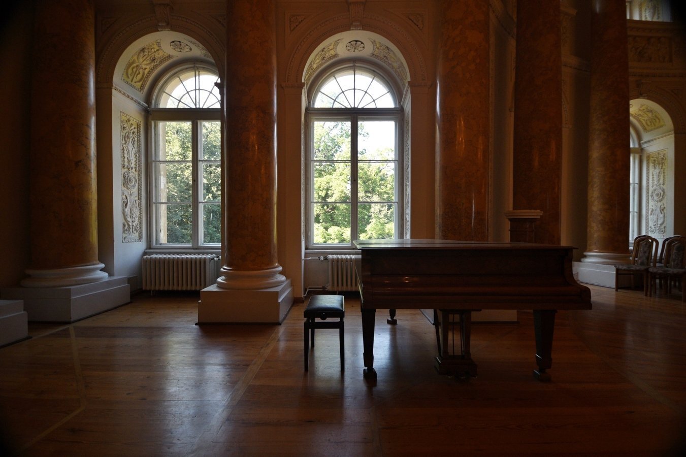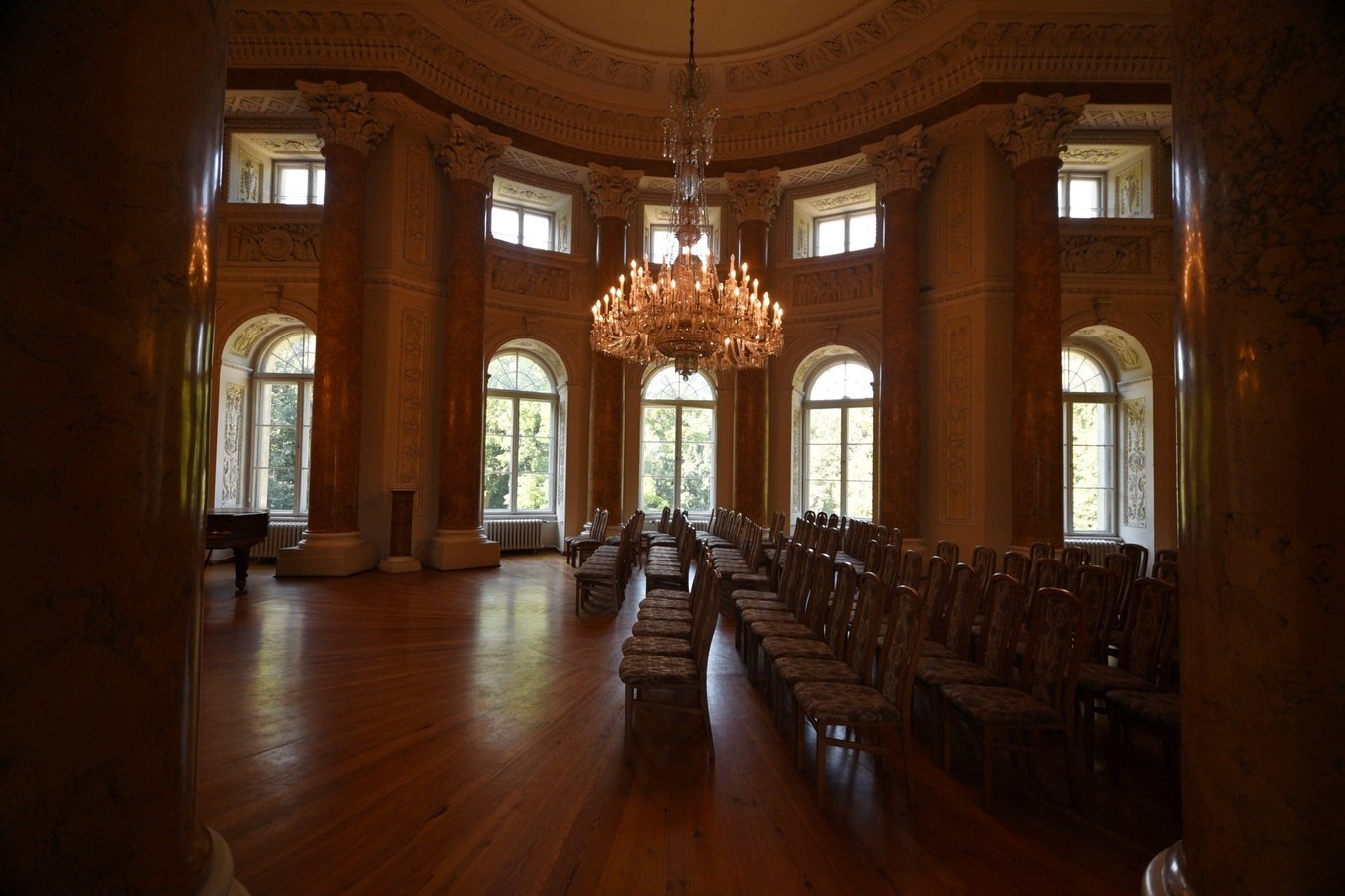 - Sala Kolumnowa — reprezentacyjne pomieszczenie z marmurowymi kolumnami korynckimi i bogatą dekoracją stiukową.