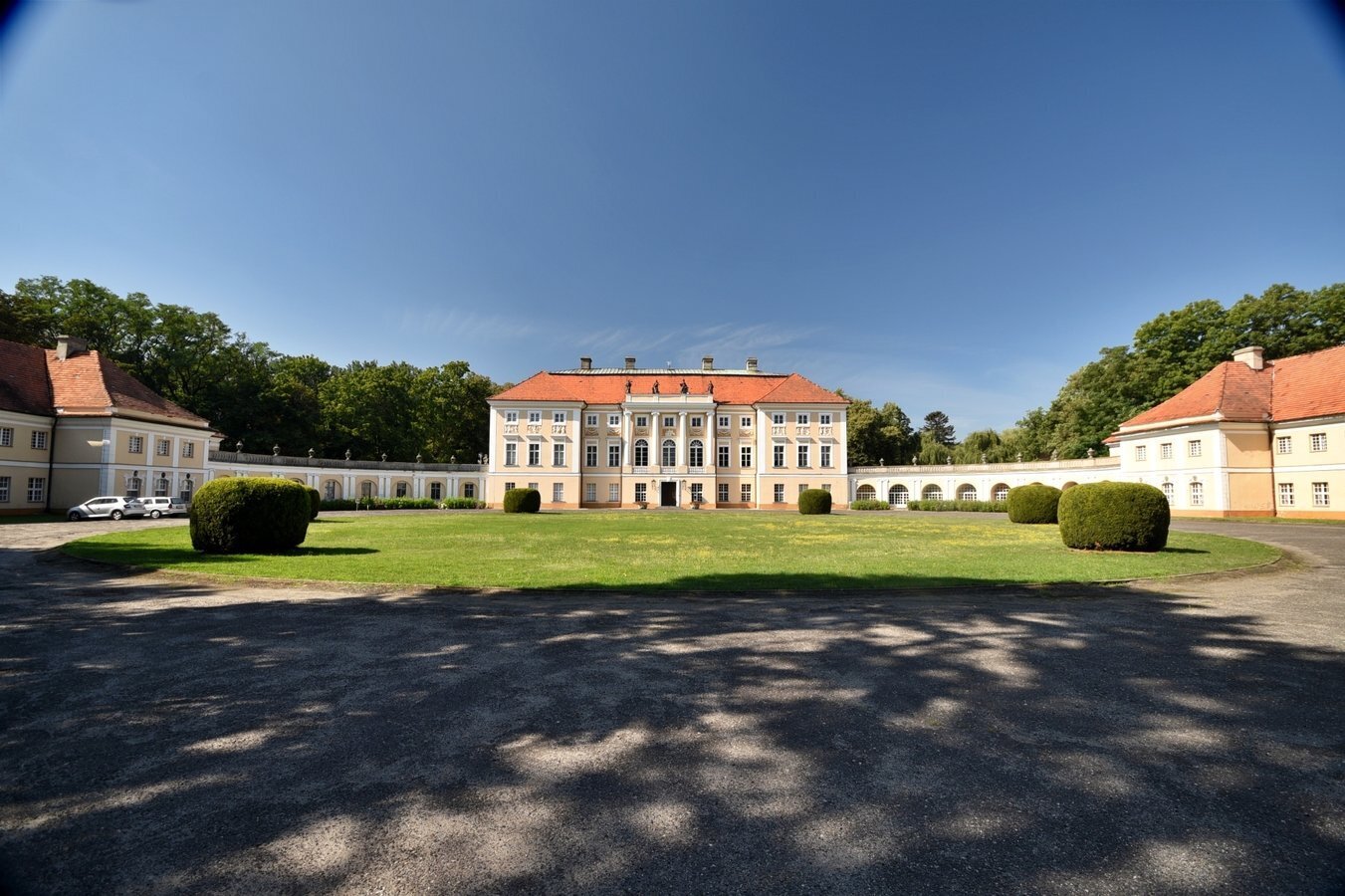- Oficyny i ćwierćkoliste galerie łączące pałac z oficynami, tworząc dziedziniec paradny.