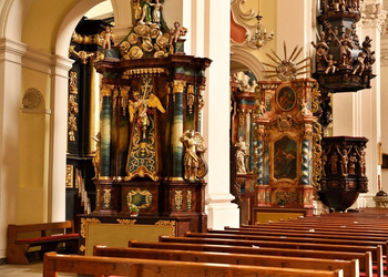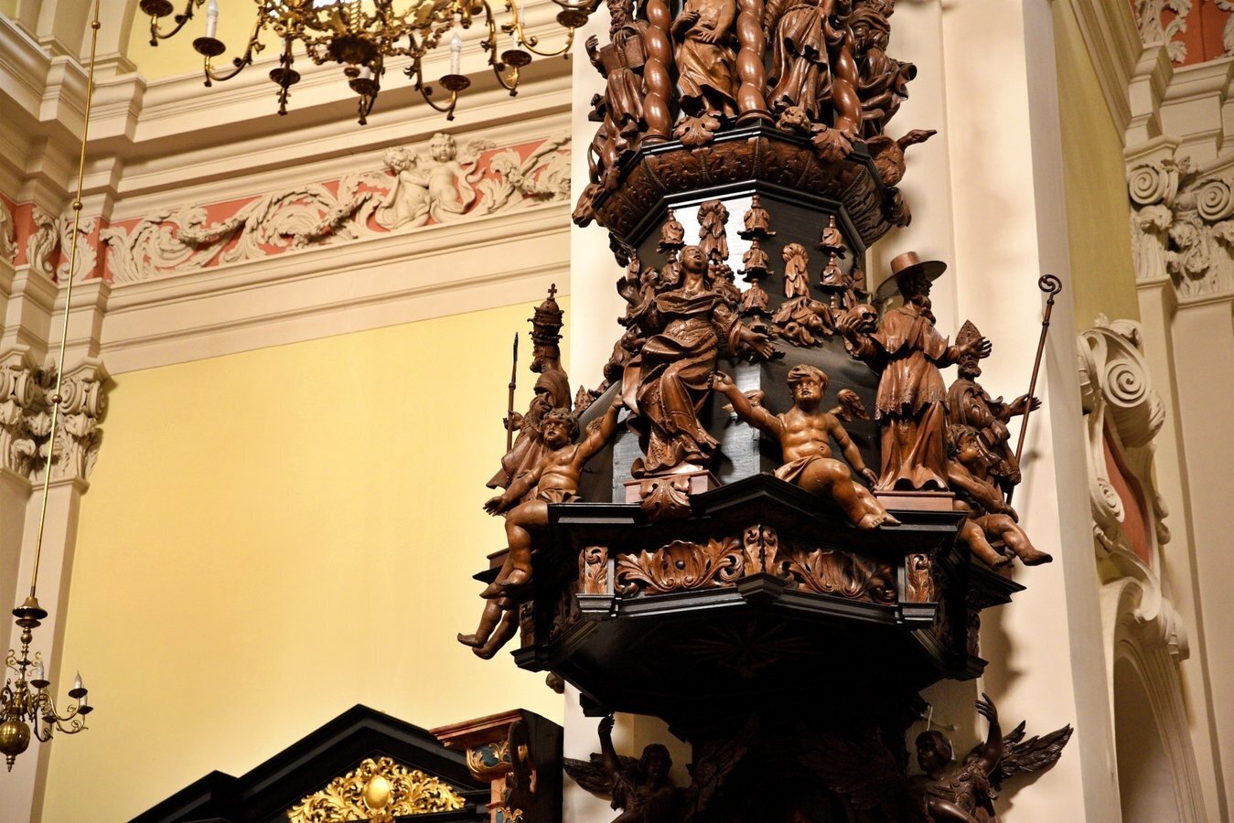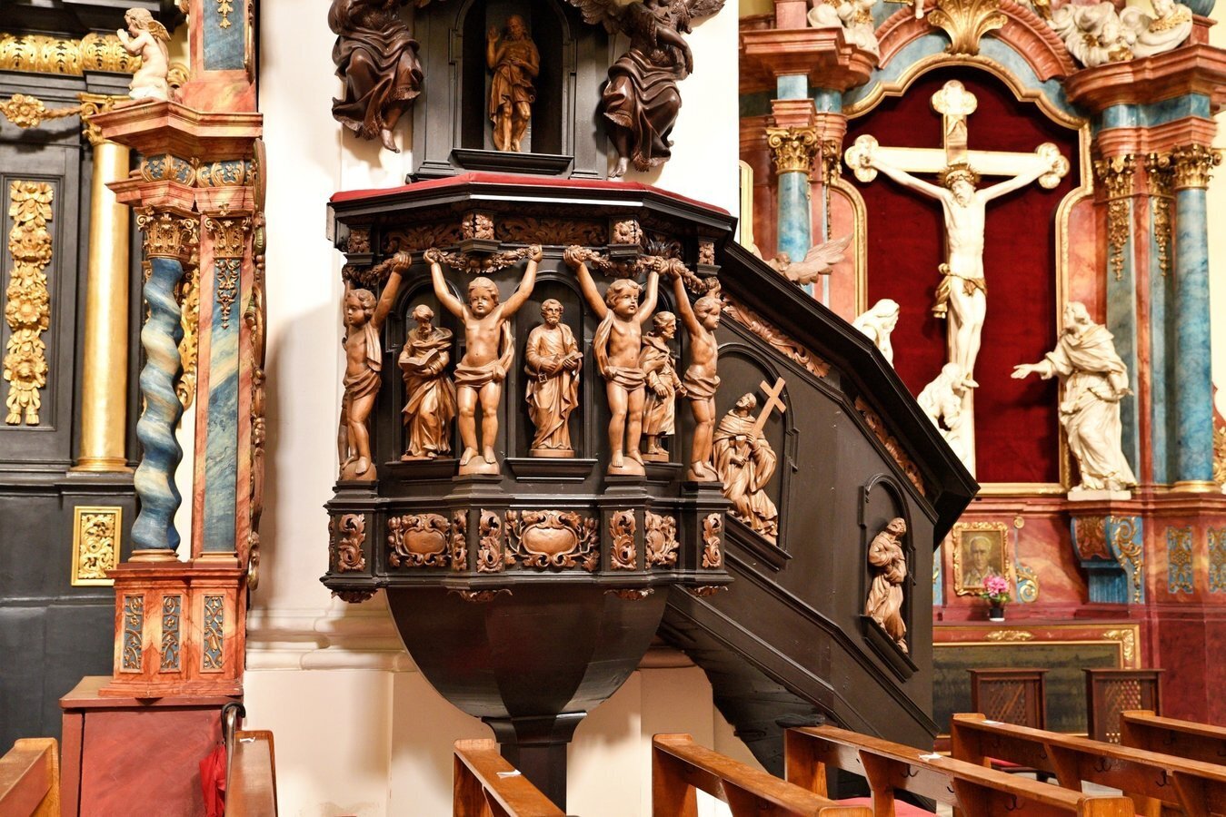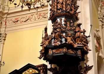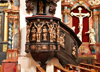 - Drewniana ambona pochodzi z XVII wieku i zachowała oryginalne polichromie,