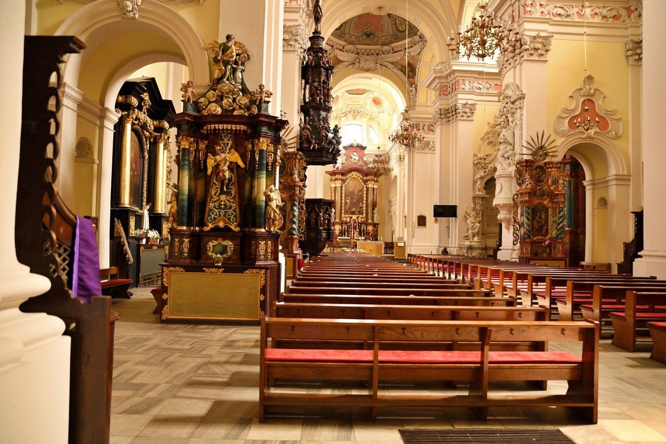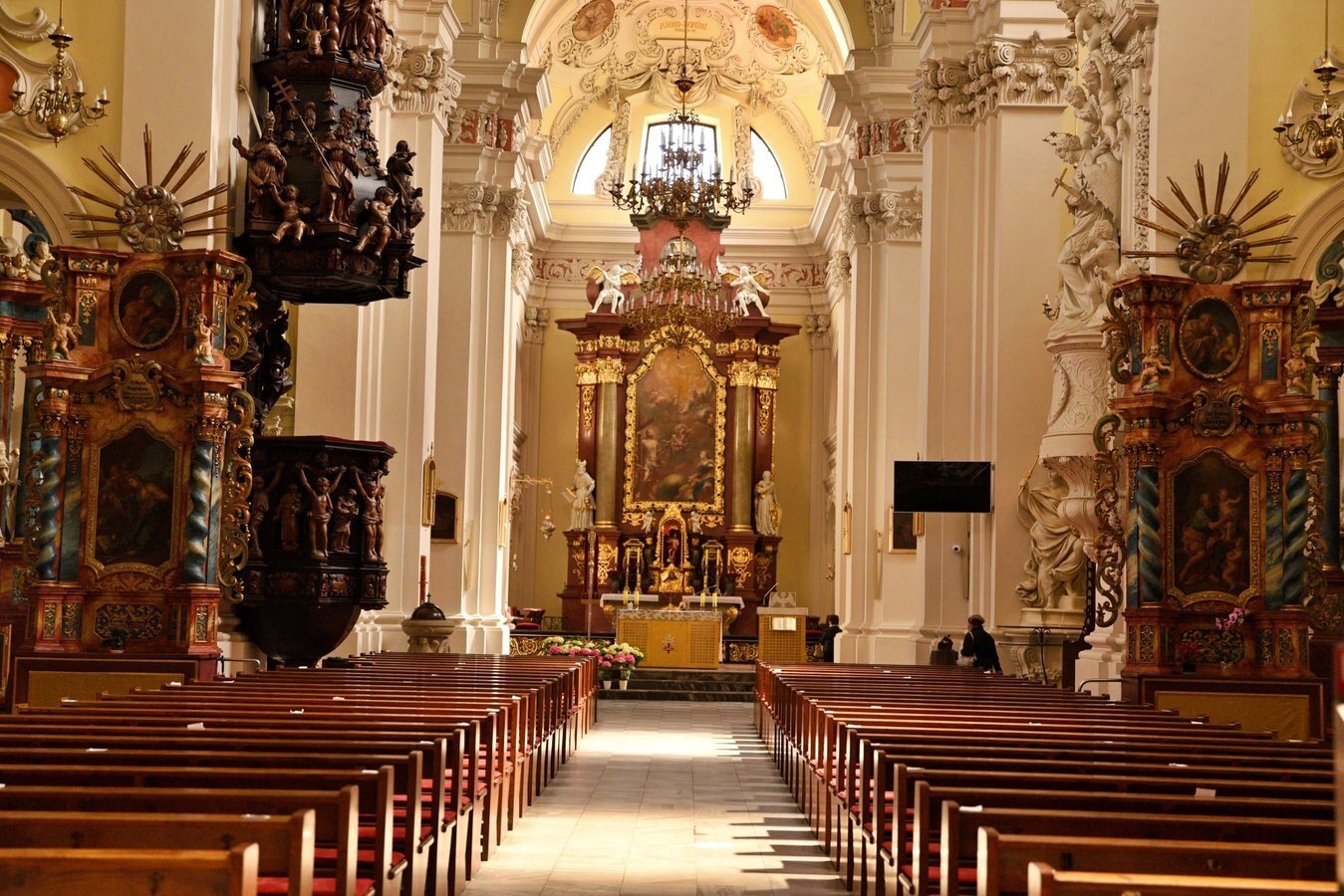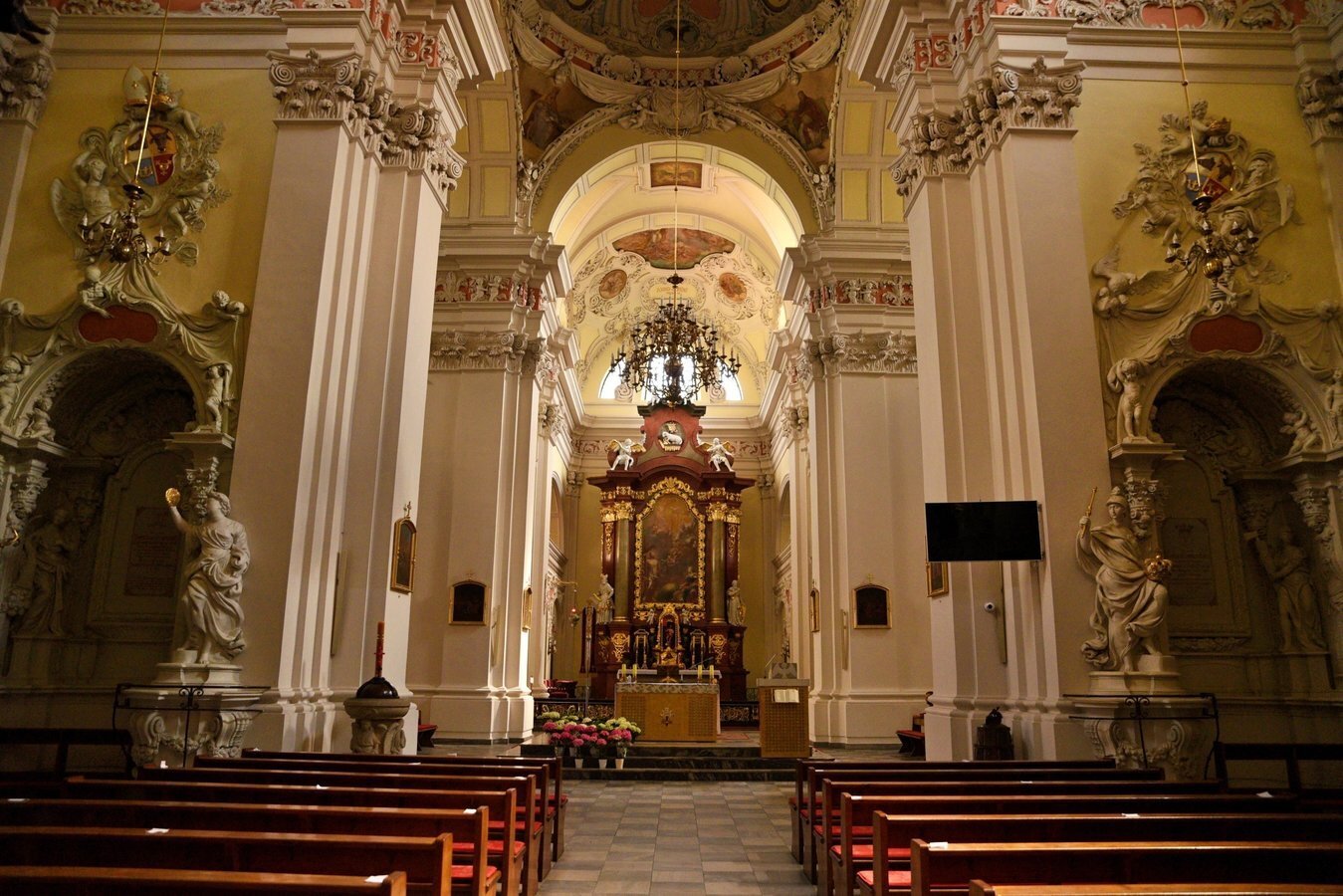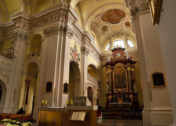 We wnętrzu bazyliki uwagę przyciąga również okazały ołtarz główny z XVIII wieku z obrazem Trójcy Świętej, przypisywanym włoskiemu malarzowi Michelangelo Palloniemu. Oprócz niego znajduje się tu dziesięć ołtarzy bocznych, każdy bogato zdobiony i poświęcony różnym świętym. Zachwyt budzi także drewniana, rzeźbiona ambona o wyjątkowo misternym detalu oraz zabytkowe organy, które nie tylko zdobią wnętrze, ale także rozbrzmiewają podczas uroczystości i koncertów muzyki sakralnej.