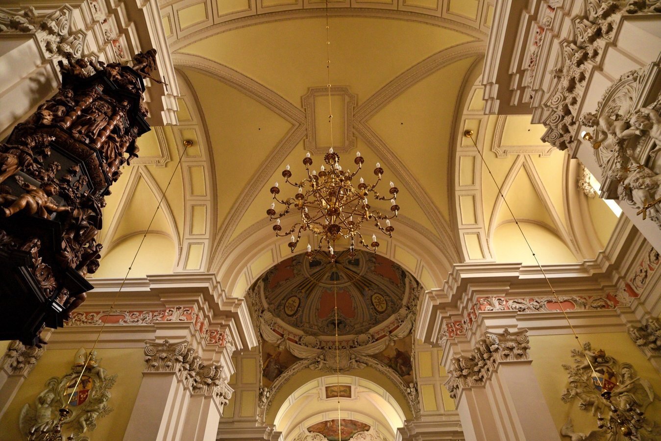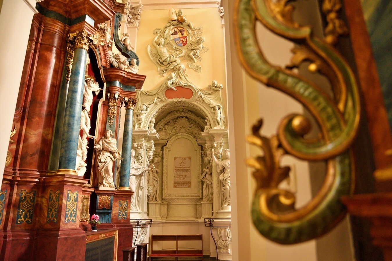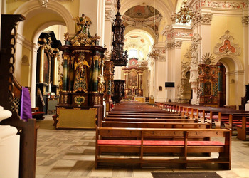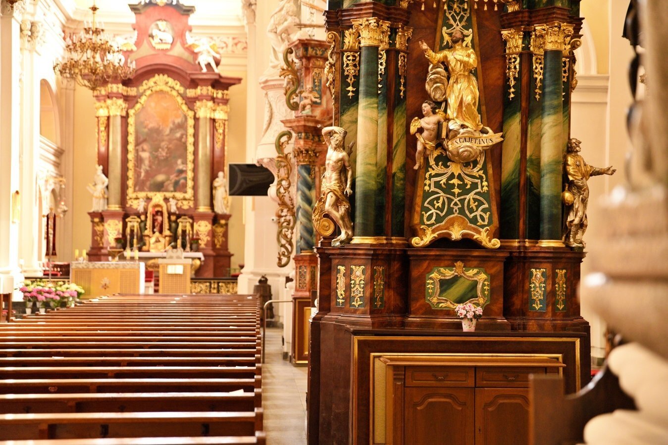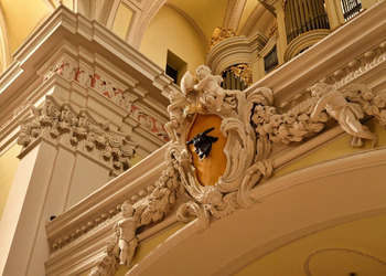We wnętrzu bazyliki uwagę przyciąga również okazały ołtarz główny z XVIII wieku z obrazem Trójcy Świętej, przypisywanym włoskiemu malarzowi Michelangelo Palloniemu. Oprócz niego znajduje się tu dziesięć ołtarzy bocznych, każdy bogato zdobiony i poświęcony różnym świętym. Zachwyt budzi także drewniana, rzeźbiona ambona o wyjątkowo misternym detalu oraz zabytkowe organy, które nie tylko zdobią wnętrze, ale także rozbrzmiewają podczas uroczystości i koncertów muzyki sakralnej.