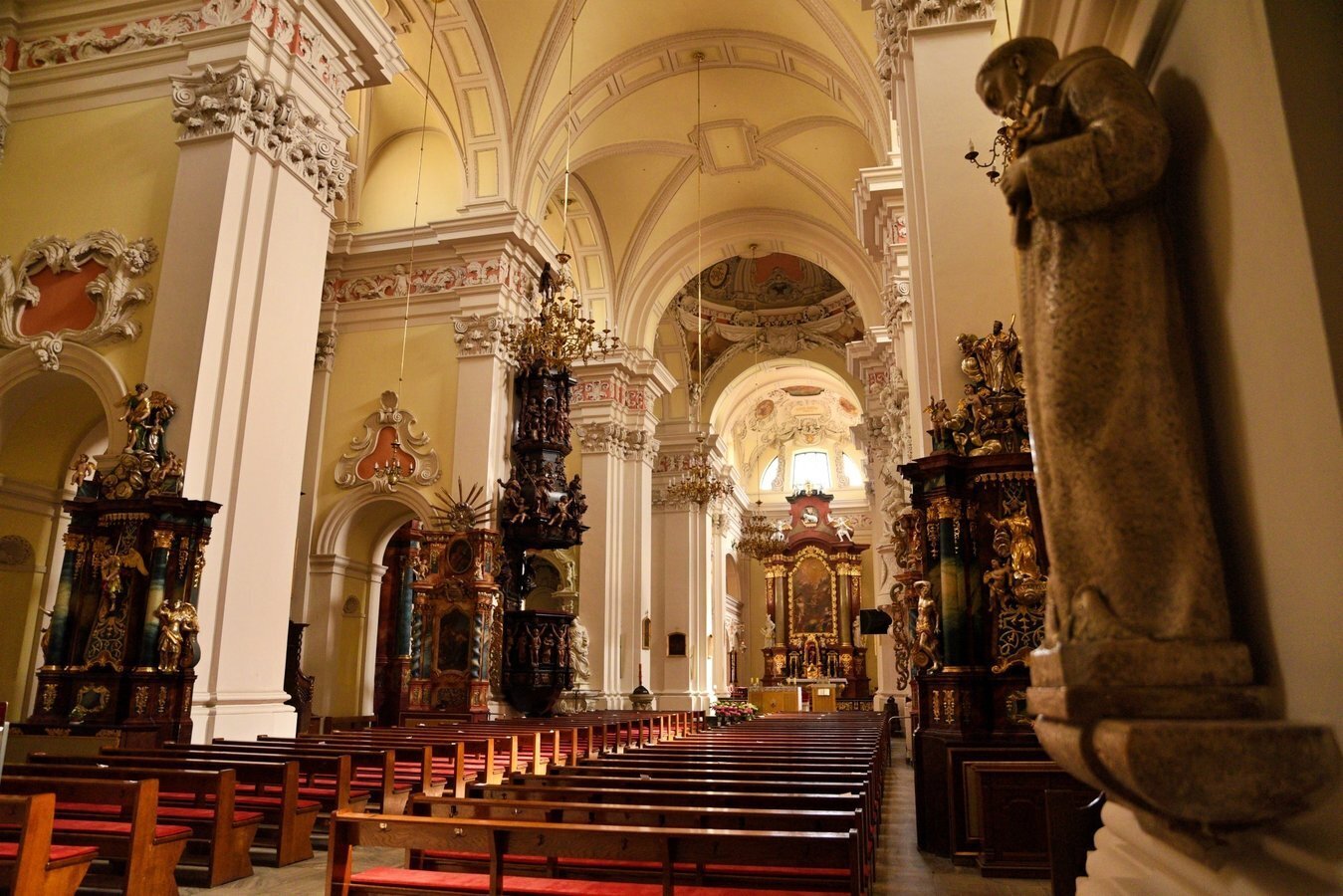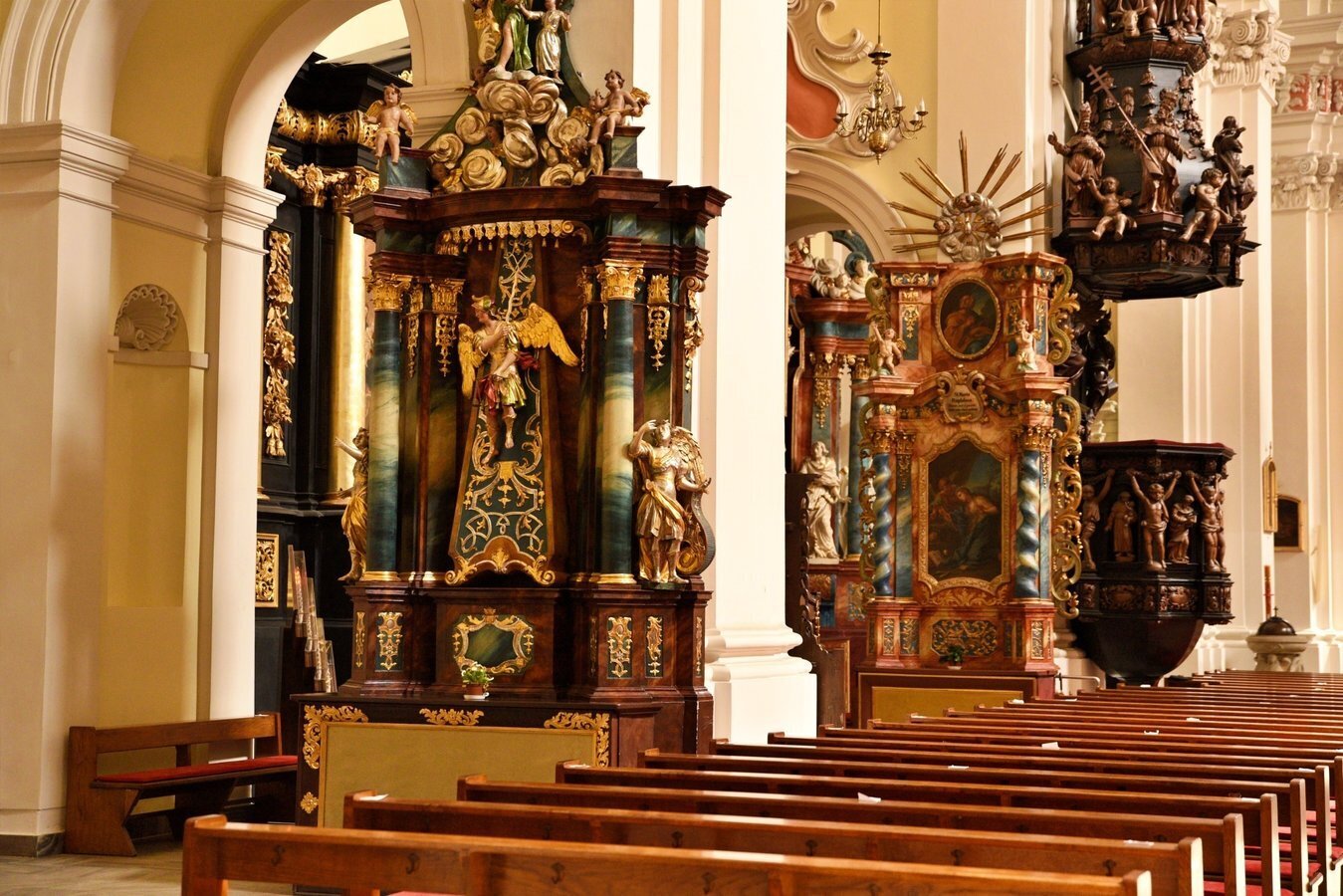 - Wnętrze zdobi 10 ołtarzy i kilkadziesiąt rzeźb sakralnych,