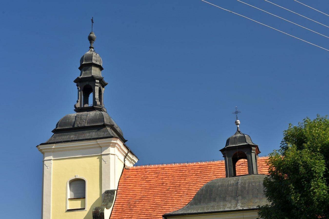 - Barkowy hełm wieży z 1772 roku „wytrzymał” różne zawieruchy na przestrzeni blisko 220 lat. Obecnie błyszczący hełm (wymieniony w 1990 roku) jest baniasty, łamany z arkadową latarnią opiętą wolutami i kryty ponownie blachą miedzianą. Na hełmie są dwa kartusze od północy z datą 1772 r. z herbem Nowina, Mielżyńskich z literami MM (Maksymilian Mielżyński), zaś od południa kartusz z herbem Leliwa Czapskich z literami KC (Konstancji z Czapskich, żony Maksymiliana Mielżyńskiego). Dach na kościele jest dwuspadowy, kryty dachówką, z ażurową wieżyczką na sygnaturkę nad prezbiterium (od wschodniej strony).