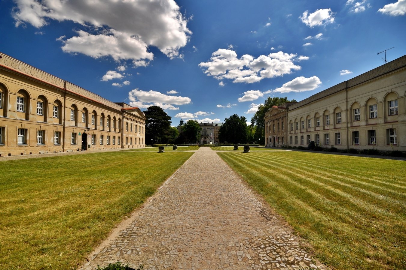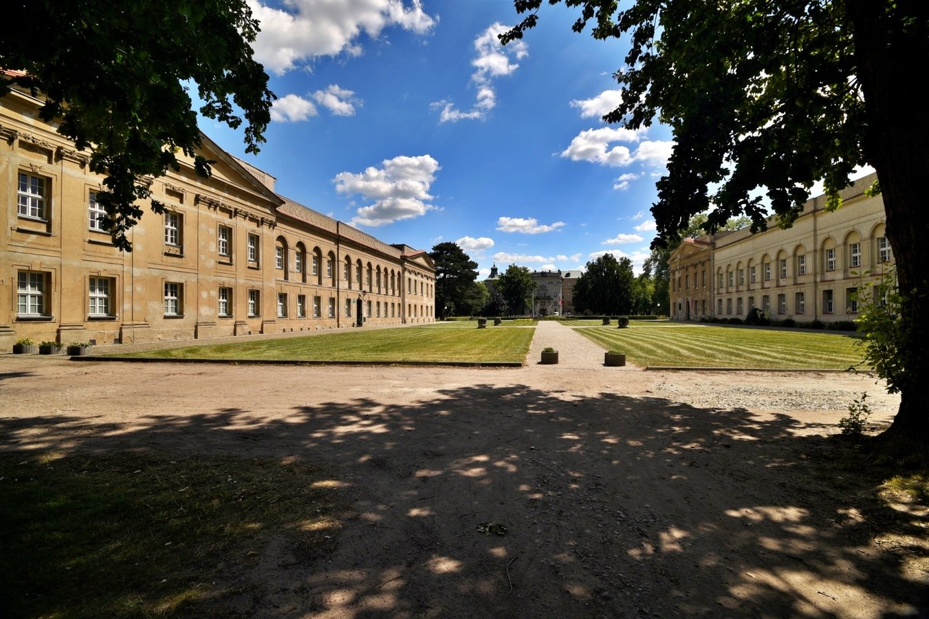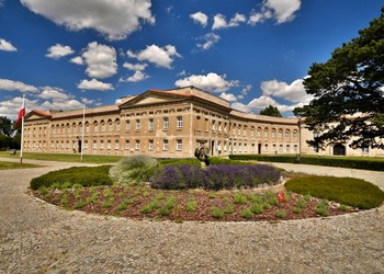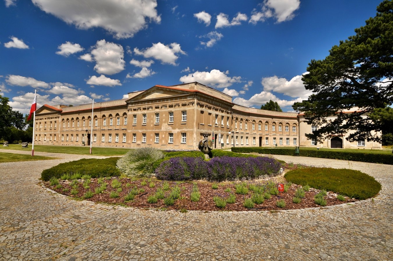 Na dawne oficyny składają się dwa zespoły budynków z drugiej połowy XVIII w. półkoliście zamykające dawny dziedziniec honorowy. Położone symetrycznie po obu stronach dawnego dojazdu do zamku od strony Leszna. Pierwotnie mieściły się tutaj m.in. ujeżdżalnia, stajnie i wozownie oraz obszerna sala redutowa. Obecnie znajduje się tutaj siedziba Specjalnego Ośrodka Szkolno Wychowawczego dla dzieci specjalnej troski, prowadzącego m.in. klasy dla głuchoniemych i warsztaty terapii zajęciowej.