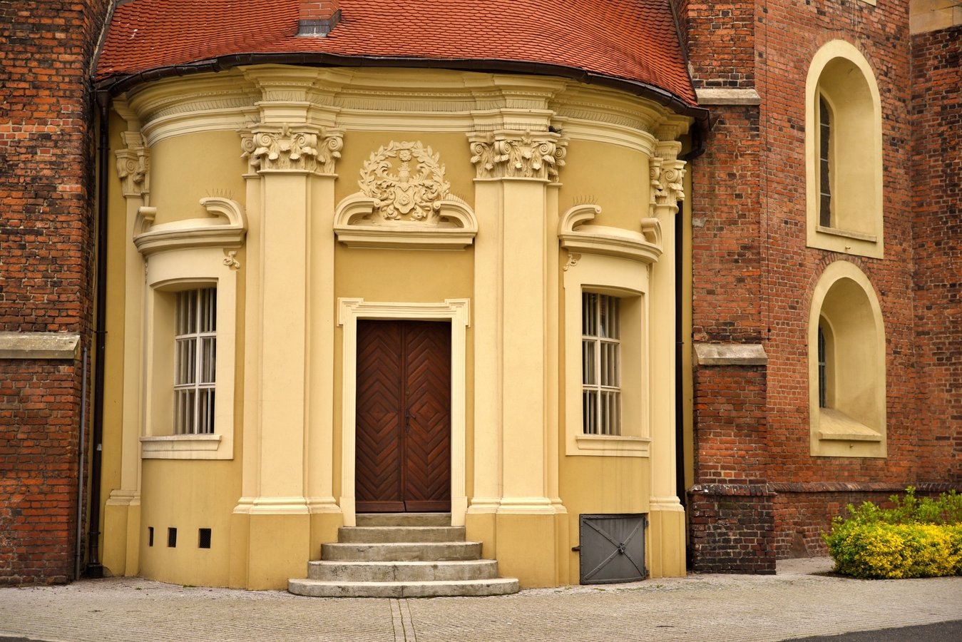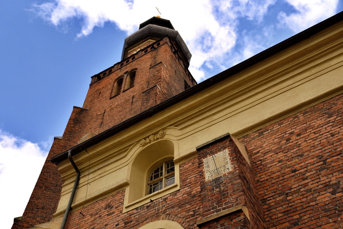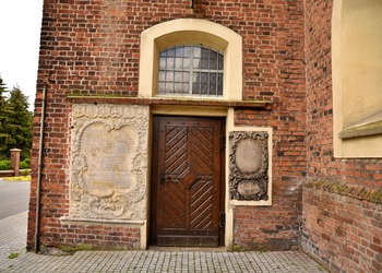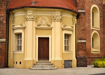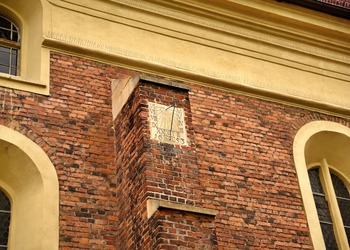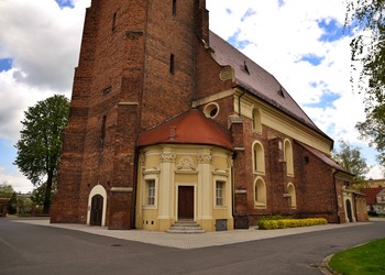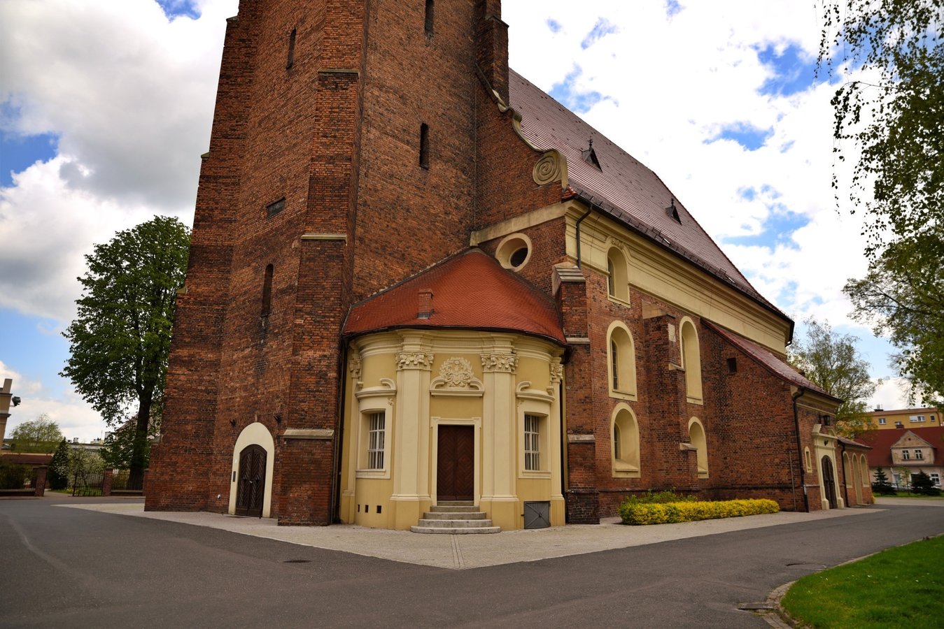 Akcentem przełamującym jednorodność ceglanej budowli świątyni jest przylegająca od strony zachodniej barokowa kaplica Gruszczyńskich – niewielki, harmonijny budynek, wtopiony pomiędzy wieżę i korpus kościoła. Kaplica zbudowana została w 1711 r. wg projektu Pompeo Ferrariego.