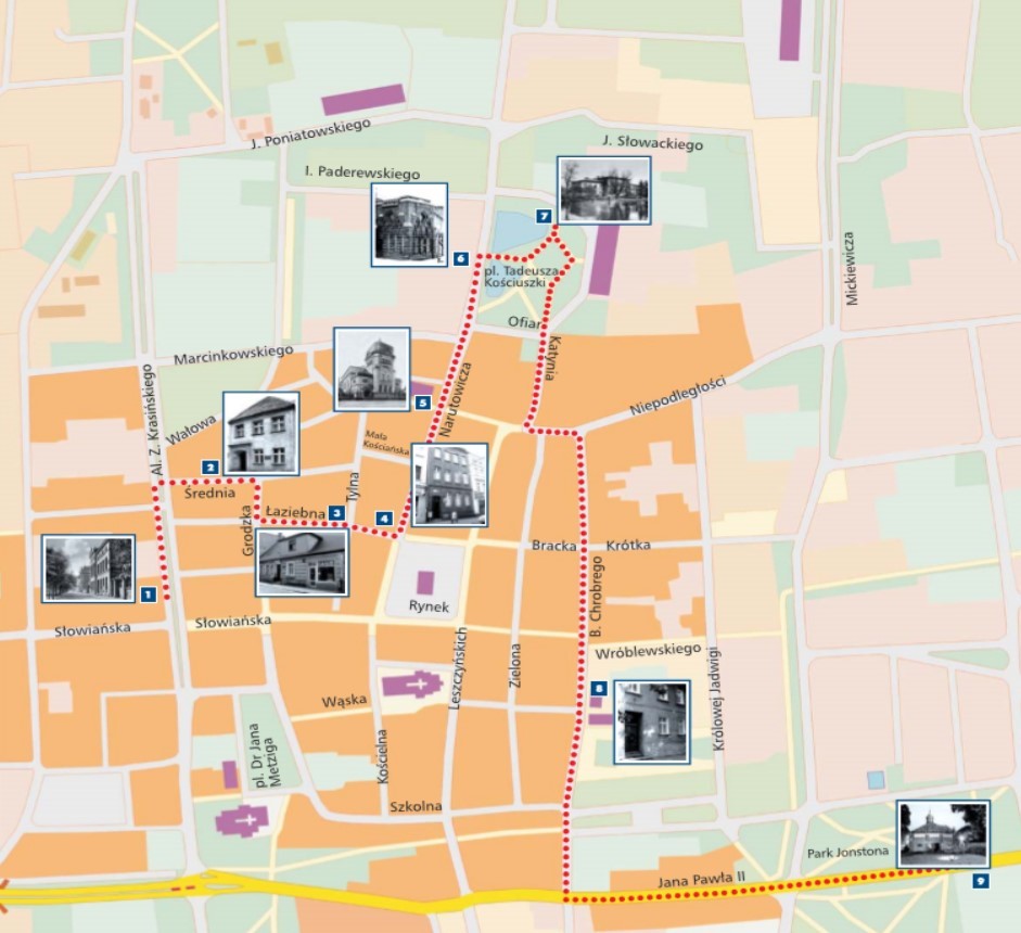 - ŻYDOWSKA SZKOŁA POWSZECHNA /ul. Krasińskiego 22/ - utworzona w 1840 r., działała do końca 1921 r., później szkoła protestancka, a po wojnie szkoła specjalna, obecnie szkoła prywatna. Budynek pochodzi z końca XIX w.