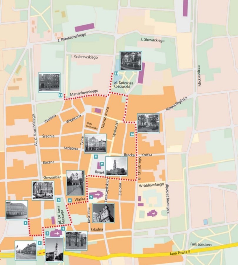 - PLAC JANA METZIGA. Budynek nr 25 wzniesiony w 1885 r. dla powszechnej szkoły katolickiej. W roku 1945 rozpoczął tu naukę Stanisław Grochowiak. Narożny budynek z I połowy XVIII w. sąsiadujący z kościołem św. Krzyża był niegdyś pastorówką. Od 1963 r. mieści Muzeum Okręgowe w Lesznie.