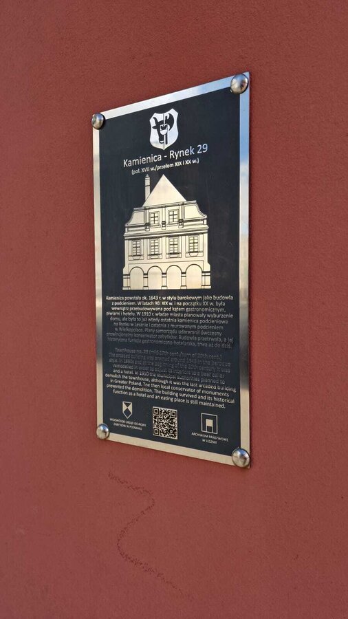 Kamienica nr 29 to najstarszy budynek w rynku. Dzięki malowniczym podcieniom, wspartym na kamiennych kolumnach, jest najczęściej fotografowaną kamienicą w rynku. Nakryta jest dachem naczułkowym, na piętrze zachowały się witraże okienne z 1905 r. Obecnie mieści hotel i restaurację.