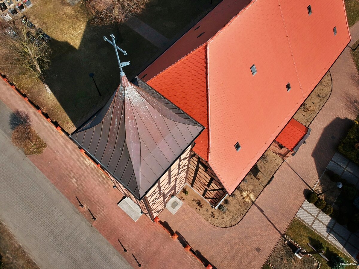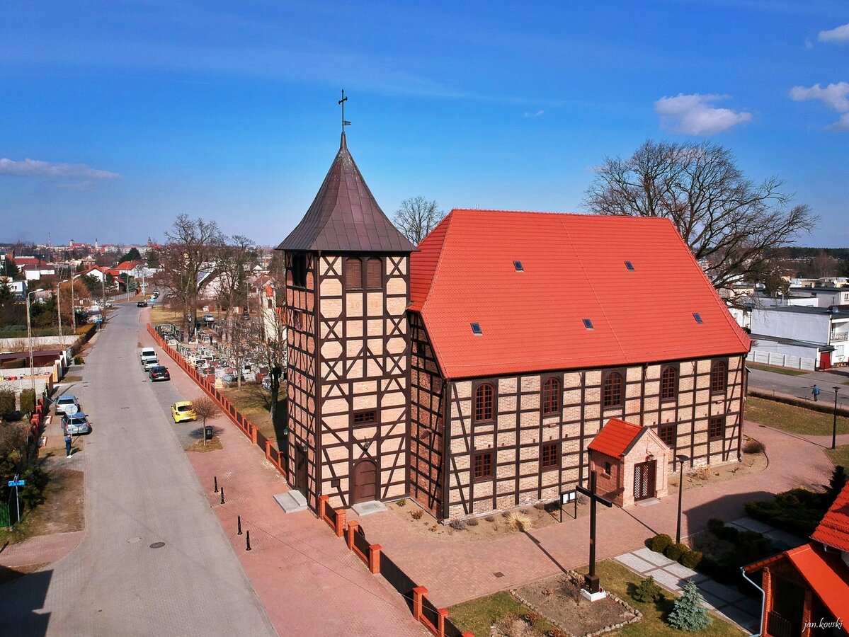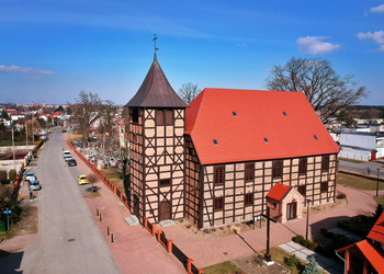 The church was built as an Evangelical temple in 1796 from the foundation of Prince Antoni Sułkowski. In 1868 a thorough renovation was carried out, with bricks being inserted into the frame structure instead of clay. In 1946 the temple was handed over to the Catholic Church.