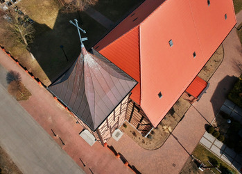 The church tower is built on a square plan. It is topped with a tin tented roof with a cross and a flag with the date “1795”.