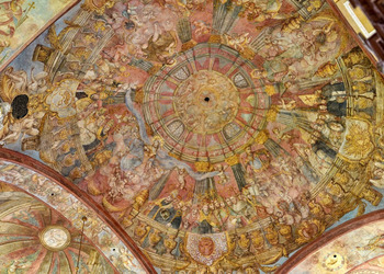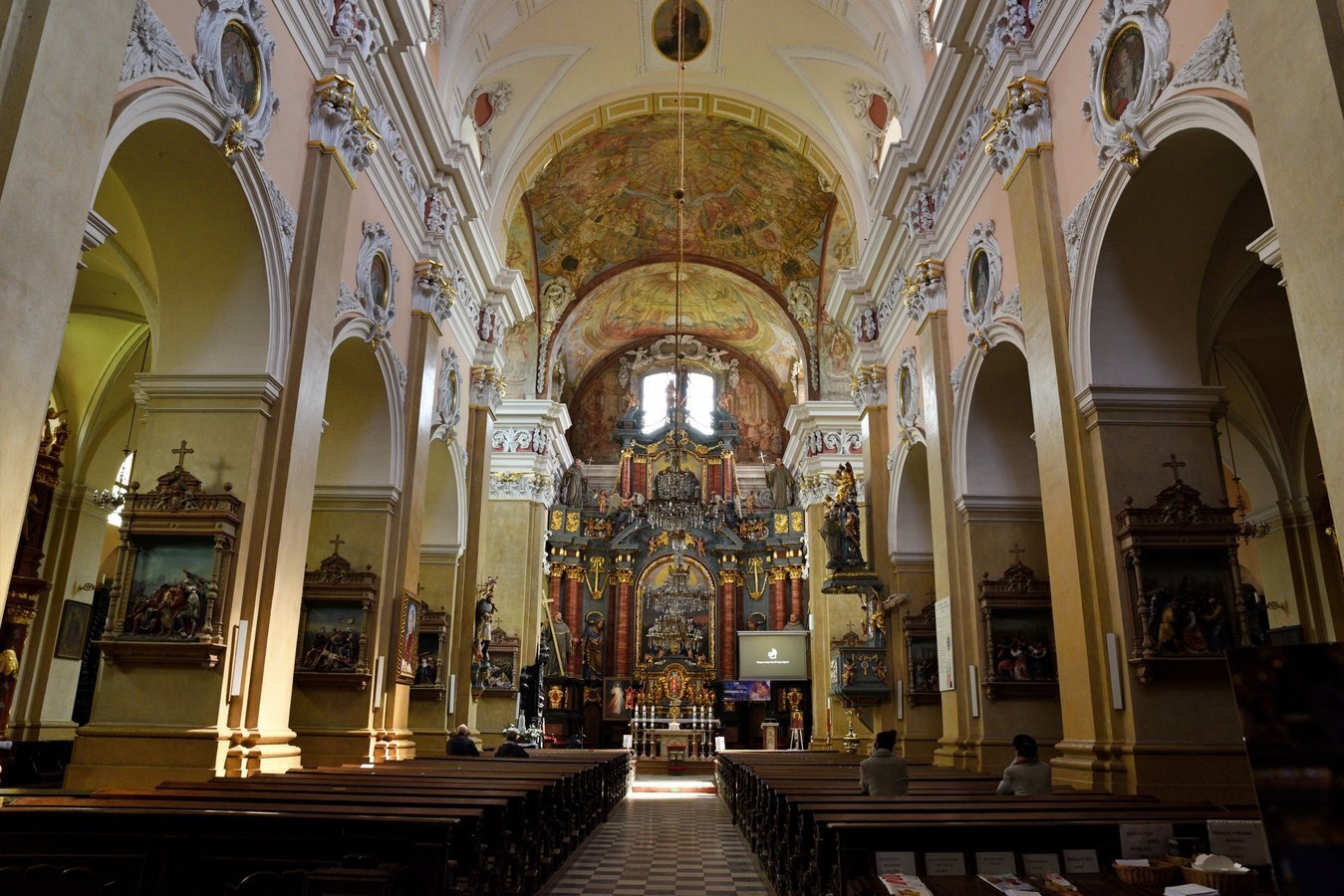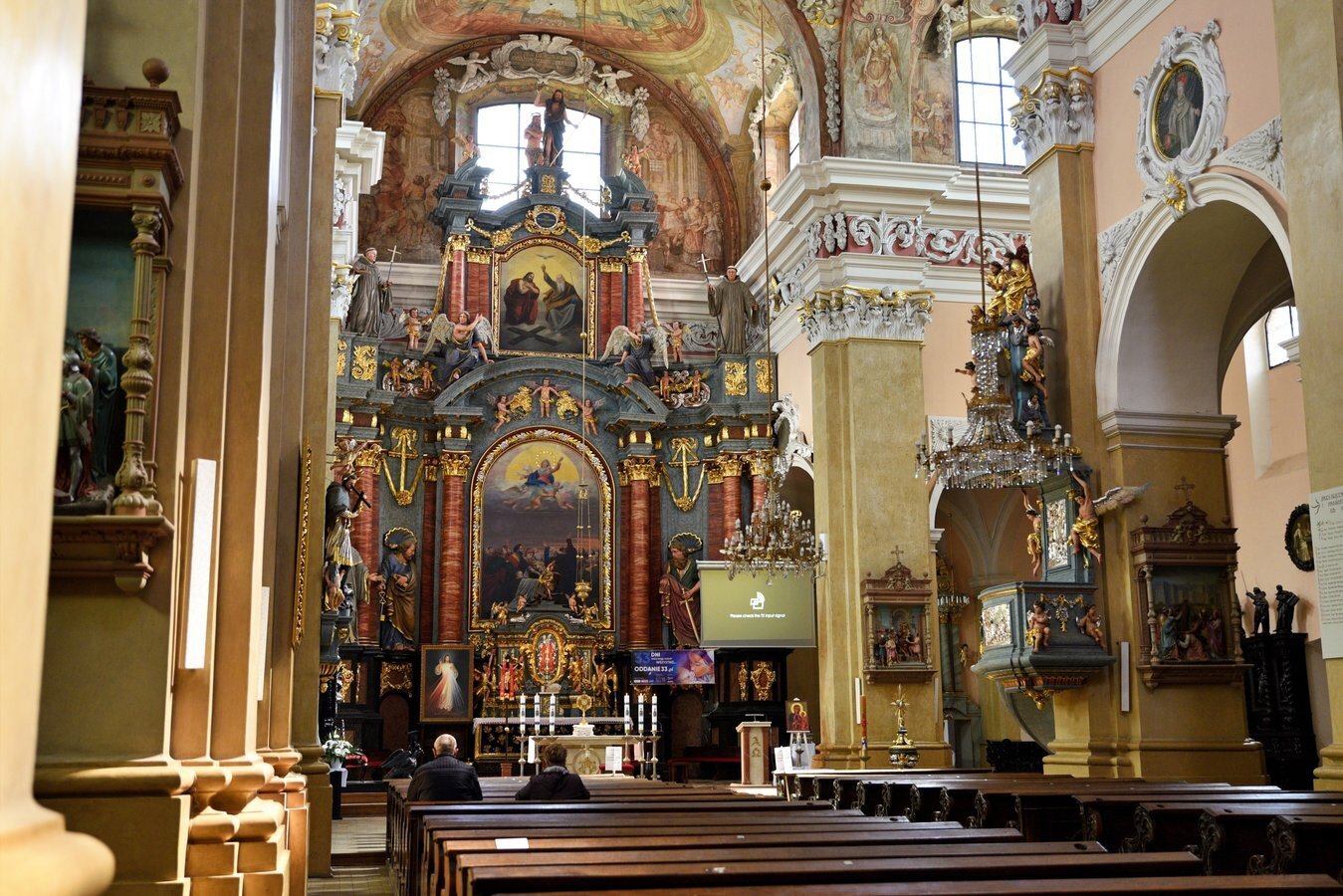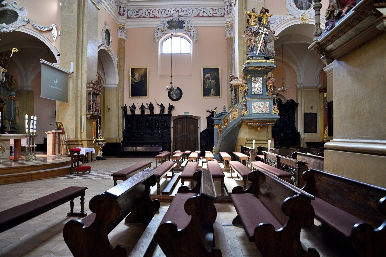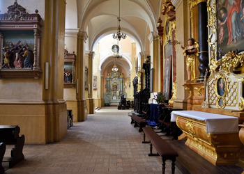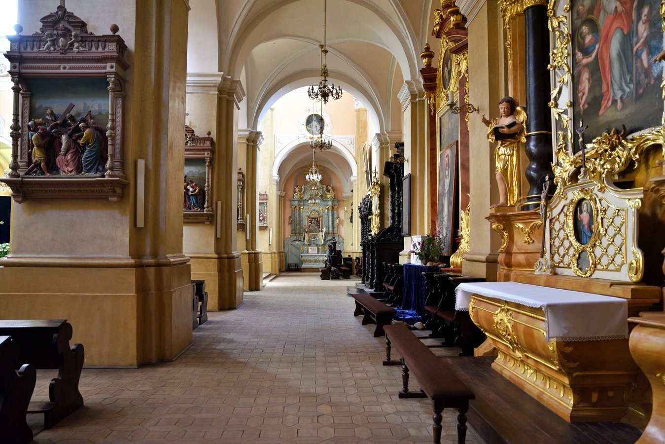 Baroque Church of St. John the Baptist was built between 1651 and 1690. The rich interior furnishings include a black oak set with intricately carved stalls, an abbot's throne with a kneeler, a pulpit, confessionals and pews, and a baptismal font in the form of a kneeling angel lifting a cup with a cover topped with a sculpture of the baptism of Christ.