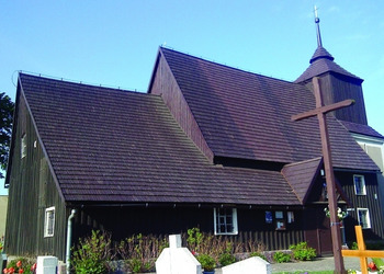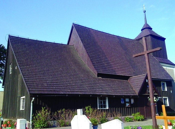Przykład drewnianego kościoła wzniesionego w konstrukcji zrębowej, oszalowanej deskami. We wnętrzu znajduje się wyposażenie z XVIII w. (m. in. ołtarz główny i ambona) oraz dwa krucyfiksy: z przełomu XVI i XVII w. oraz z końca XVII wieku.