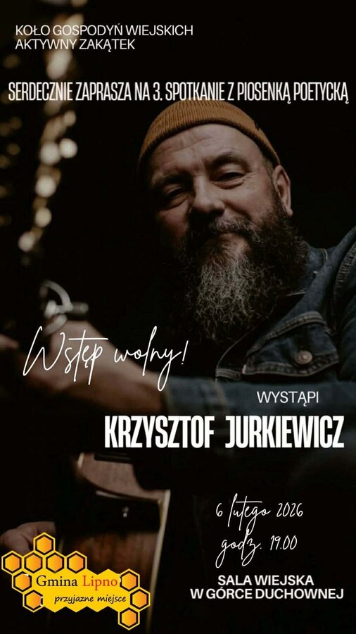 Głównym gościem wieczoru będzie Krzysztof Jurkiewicz – artysta znany z kameralnych koncertów i repertuaru osadzonego w nurcie piosenki poetyckiej. Jego występ zapowiada się jako pełen ciepła i muzycznej wrażliwości wieczór, który z pewnością trafi do miłośników spokojnych, literackich brzmień.