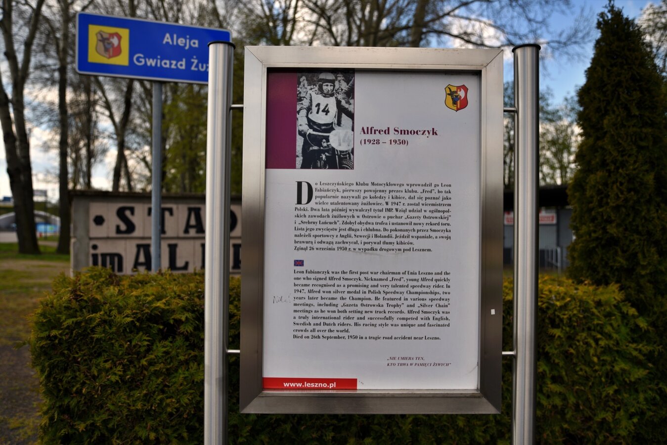 Pomnik Alfreda Smoczyka, legendarnego polskiego żużlowca, odsłonięto oficjalnie 10 maja 2008 roku w dniu rozgrywania zawodów Grand Prix Europy. Odlany z brązu posąg, zamontowany został na skwerku im. Alfreda Smoczyka, od strony ul. 17 Stycznia. Przedstawia wtapiającego się w przechodniów, naturalnej wielkości postać żużlowca opartego o motocykl. Zawodnik ubrany jest w strój żużlowy, ma na sobie plastron z orłem.