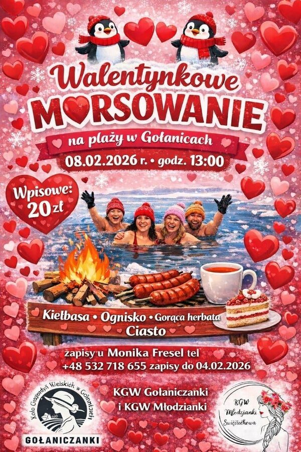Po raz drugi na plaży w Gołanice odbędzie się wyjątkowe walentynkowe morsowanie, na które zapraszają Koło Gospodyń Wiejskich Gołaniczanki oraz Koło Gospodyń Wiejskich Młodzianki w Święciechowie. Wydarzenie zaplanowano na 8 lutego 2026 roku, a jego rozpoczęcie przewidziano na godzinę 13:00.