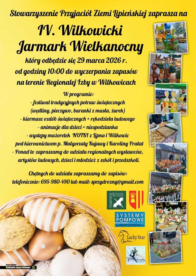 Stowarzyszenie Przyjaciół Ziemi Lipieńskiej zaprasza mieszkańców regionu na IV. Wilkowicki Jarmark Wielkanocny, który odbędzie się 29 marca 2026 roku na terenie Regionalnej Izby w Wilkowicach. Wydarzenie rozpocznie się o godzinie 10:00 i potrwa do wyczerpania zapasów.