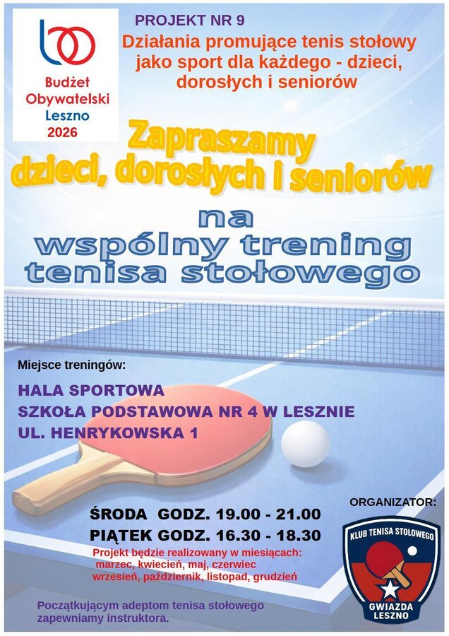 Zapraszamy na wspólne treningi tenisa stołowego w ramach Budżetu Obywatelskiego Leszno 2026
