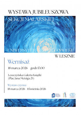 W Leszczyńskiej Galerii Książki przy Placu Jana Metziga 25 wernisaż 18 marca 2026 o 17:00 otworzy wystawę jubileuszową Sekcji Malarskiej działającej przy Uniwersytecie Trzeciego Wieku w Lesznie. Ekspozycja będzie dostępna dla zwiedzających od 18 marca do 11 kwietnia 2026.